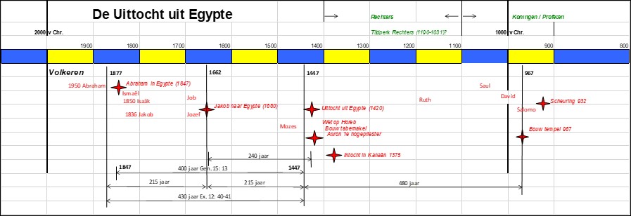 Om het geheel van het hier beschreven tweede deel van de Bijbelse Geschiedenis nogmaals te overzien, herhalen we hier het overzicht in de vorm van de tijdlijn. Zie deze tijdlijn. (link, geheel, na alles gereed) De informatie in deze paragraaf heb ik samengevat in beeld gebracht in de presentatie " Mozes en Jozua ". Daarin staan ook nadere details, meer kaarten en een tijdlijn. De plagen in Egypte worden ook beschreven in psalm 105 in het Bijbelboek Psalmen. De woestijnreis is ook beschreven in psalm 106 in het Bijbelboek Psalmen.